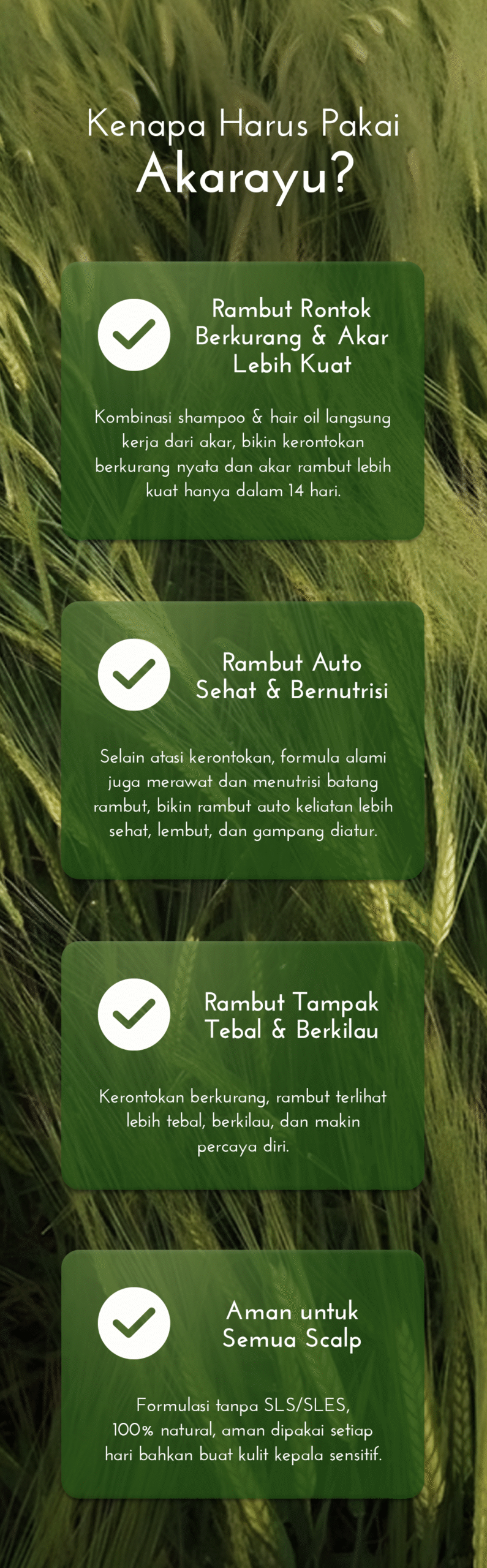 Akarayu hadir buat bantu kamu rawat rambut dari akarnya — bukan cuma bersihin, tapi juga menutrisi biar tumbuh sehat dan kuat 🌿